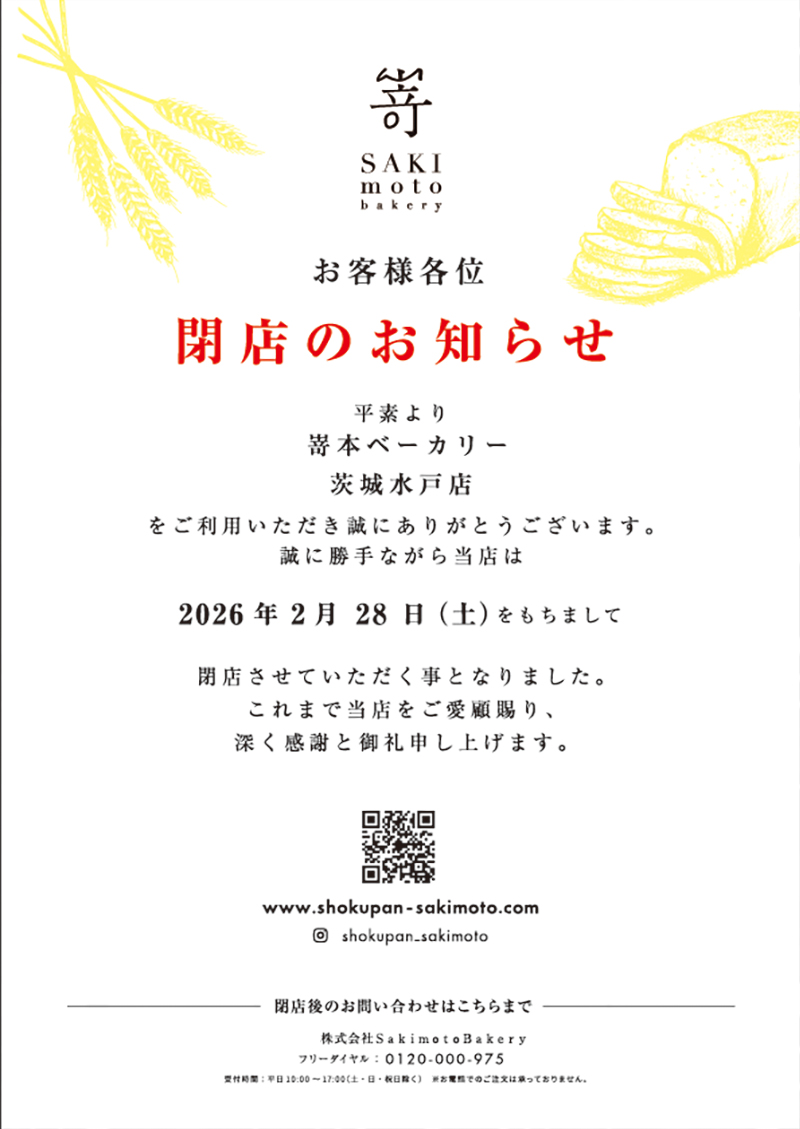 誠に勝手ながら嵜本ベーカリー茨城水戸店を、2026年2月28日(土)に閉店させていただくこととなりました。