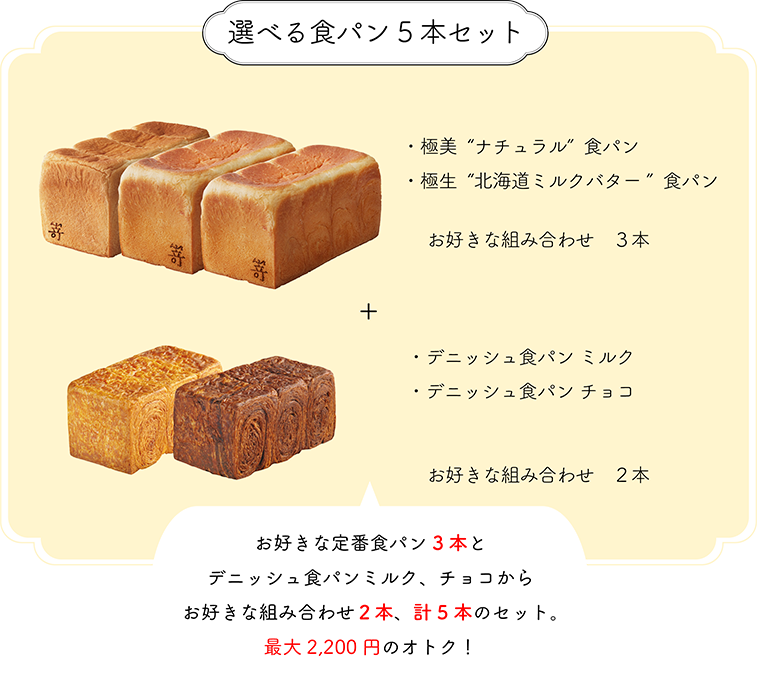 定番のナチュラル食パンやミルクバター食パンをはじめ、デニッシュ食パン、and moreの焼菓子まで、人気商品を組み合わせたセットを多数ご用意しました。