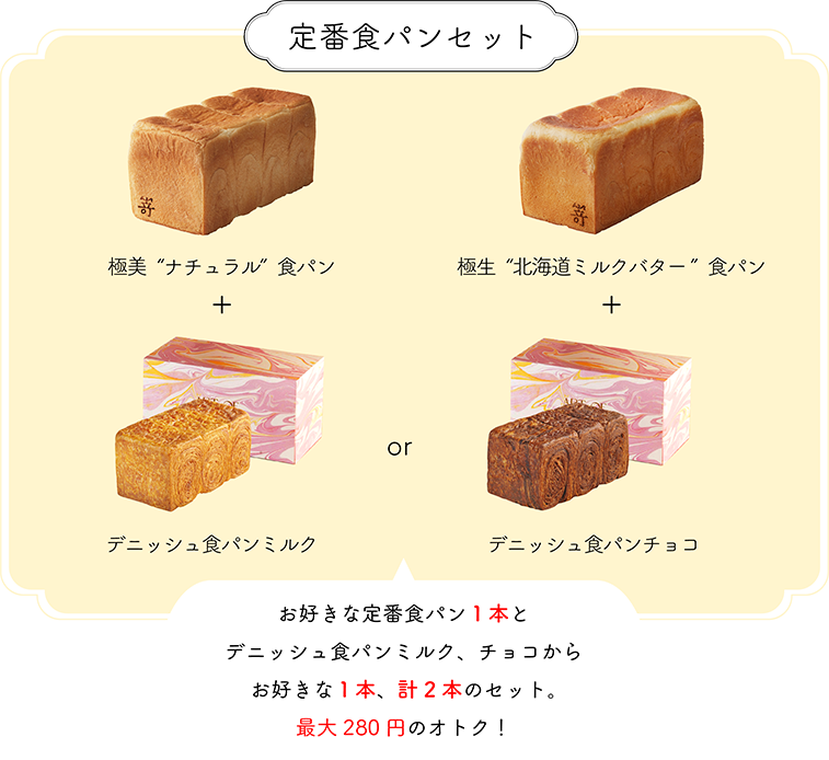 定番食パンは極美“ナチュラル”食パン、または極生“北海道ミルクバター”食パンのいずれかをお選びください。