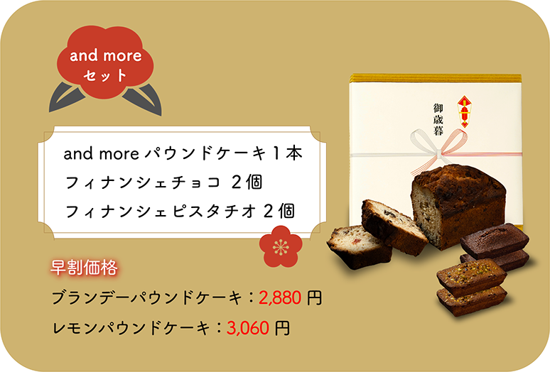 and more ブランデーパウンドケーキ(1個)+and more フィナンシェチョコ・ピスタチオ(各2個)