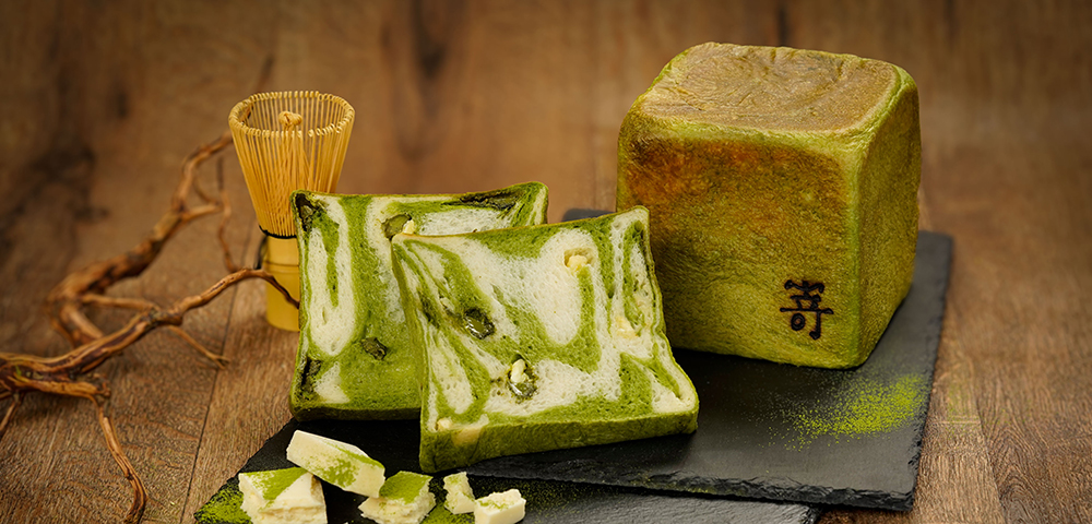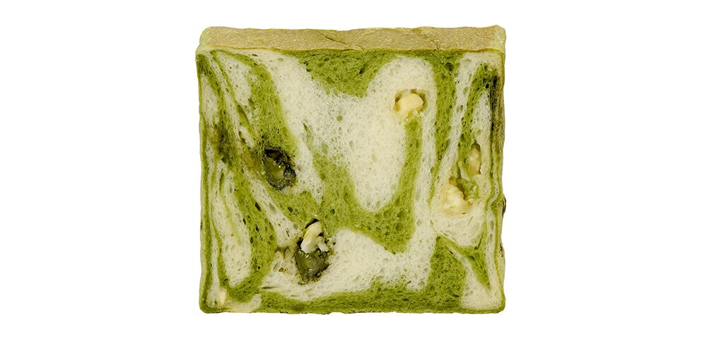 湯種製法で仕込んだもっちり食感のパン生地に、宇治抹茶を練り込み、鮮やかな緑色に。