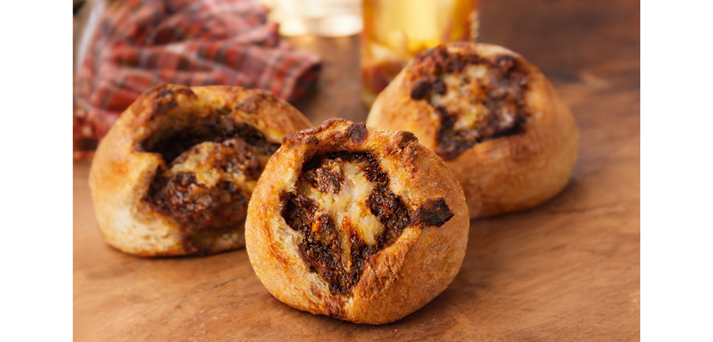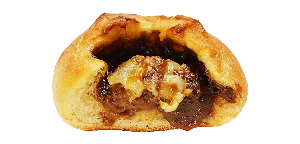香ばしく焼き上げたフランスパン生地に、角切りのビーフとビーフシチューを包み込み、仕上げにゴーダチーズをのせて焼き上げました。